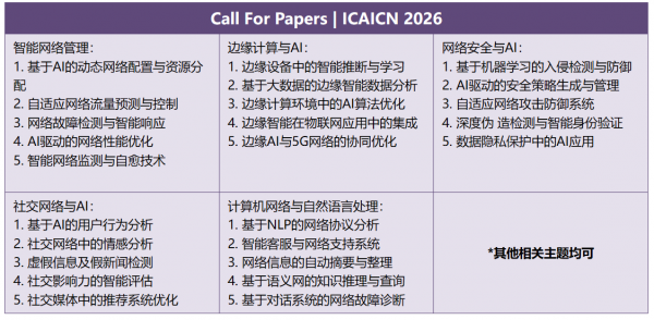 ICAICN 2025于2025年4月11-13日在中国深圳成功召开,以其影响力和高水准见证了人工智能与计算机网络技术的蓬勃发展,也收获了来自各地专家学者的积极参与和认可。ICAICN 2026由广州理工学院主办,将继续关注人工智能与计算机网络技术领域的新挑战问题和研究方向,着力反映国际人工智能与计算机网络技术研究的最新进展。大会届时将邀请国内外相关领域知名学者到会作报告,与各与会者分享交流各领域的前沿研究成果,欢迎广大专家、学者踊跃投稿参会!